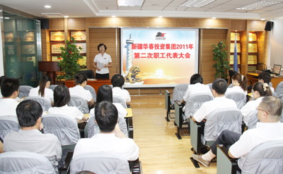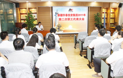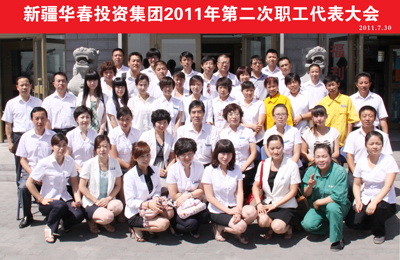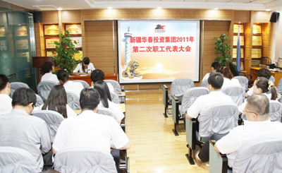 新疆華春投資集團有限公司2011年第二次職工代表大會于7月30日上午在新疆華春投資集團子公司新疆恒潤實業有限公司培訓室召開,會議由高青同志主持。參加會議的應到職工代表51人,實到職工代表 49人。