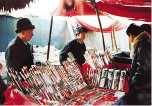 新(xin)(xin)疆出小(xiao)(xiao)刀(dao)(dao)(dao)的地(di)方很多,其中有英吉沙(sha)小(xiao)(xiao)刀(dao)(dao)(dao)、莎車(che)買(mai)買(mai)提折刀(dao)(dao)(dao)、伊犁沙(sha)木薩克折刀(dao)(dao)(dao)、和田(tian)墨(mo)玉奎雅折刀(dao)(dao)(dao)等(deng)。維吾爾(er)族(zu)做(zuo)刀(dao)(dao)(dao)的歷史悠(you)久,由于工藝(yi)精湛,成為新(xin)(xin)疆的名牌(pai)產品。在眾多的小(xiao)(xiao)刀(dao)(dao)(dao)中,沙(sha)雅小(xiao)(xiao)刀(dao)(dao)(dao)以(yi)小(xiao)(xiao)巧玲瓏、裝飾精美而獨(du)樹一幟。我們在這條街上(shang)欣賞到的小(xiao)(xiao)刀(dao)(dao)(dao)普遍(bian)只有一支香煙(yan)那么長(8-9厘米(mi)),最(zui)小(xiao)(xiao)的只有3厘米(mi),如同絕美的藝(yi)術品,叫人愛不釋手。