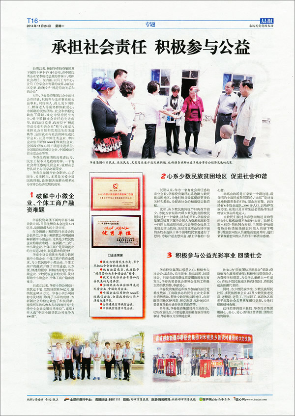 華春集團,以創造更多財富讓更多人分享的崇高使命和強烈的社會責任感,得到各級黨政和社會各界的首肯。本周,晨報以《承擔社會責任 積極參與公益》為題,又用一個整版對華春的善舉進行了大篇幅的報道。