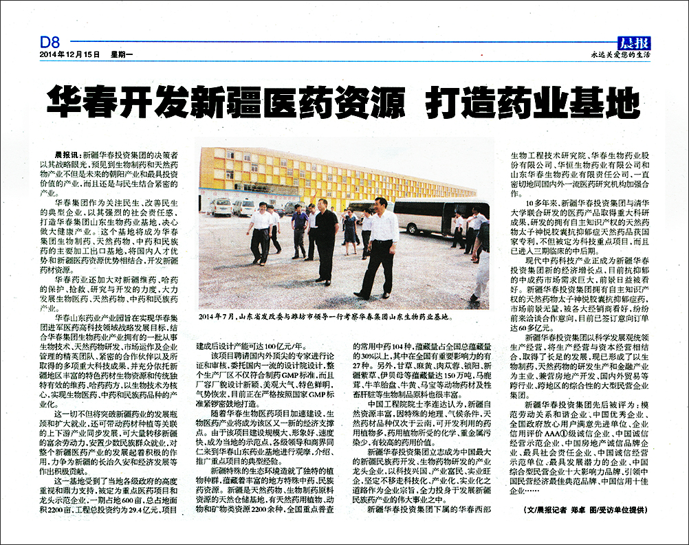 大(da)健(jian)康產業與民生結合(he)緊(jin)密,不僅(jin)是(shi)最具(ju)投資(zi)(zi)價值(zhi)的黃金(jin)產業,又是(shi)功德(de)無量(liang)的產業,得到媒(mei)體的關注,晨報于12月15日以(yi)“華(hua)春開發(fa)新疆(jiang)醫藥(yao)資(zi)(zi)源 打造藥(yao)業基(ji)地”為(wei)題(ti),進(jin)行了半個版的報道。