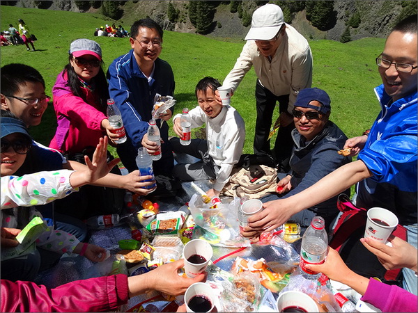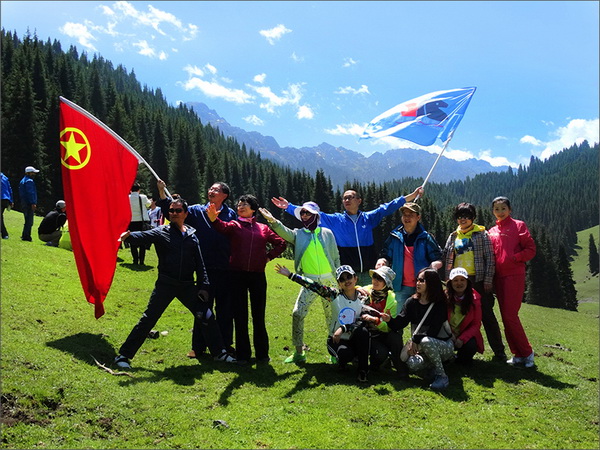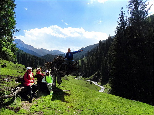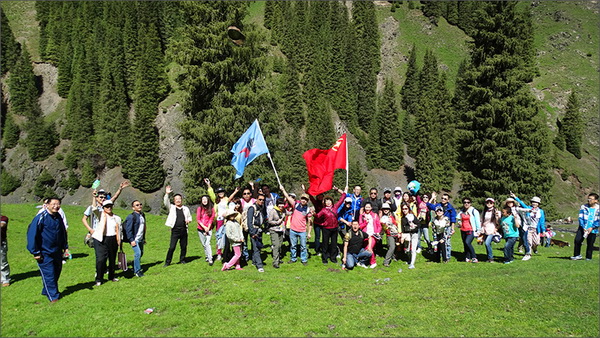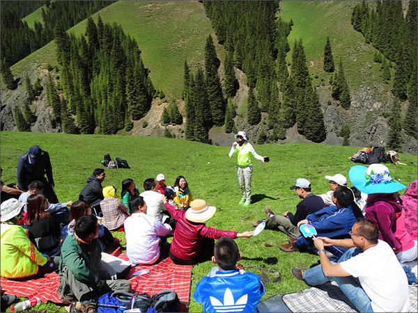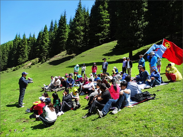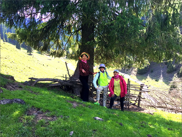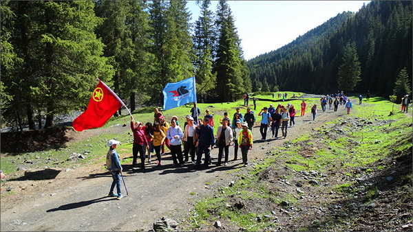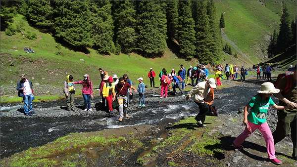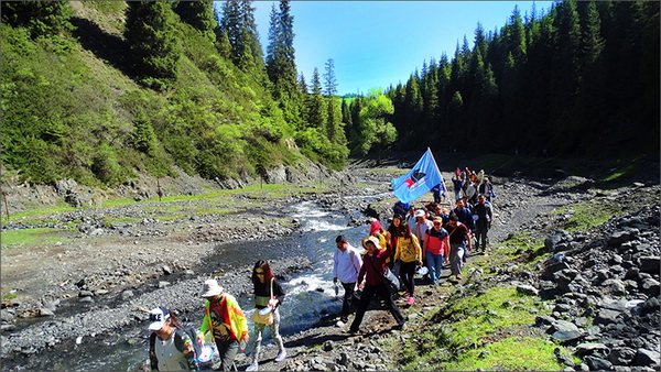 從喧囂的都市來到南山群山中風景優美的溝谷之一沙溝,這個位于北天山支脈北麓的山區,集中的展現著大美新疆的妙景。深邃的峽谷,蒼翠欲滴,在重峰疊嶂、唯有山羊才能攀巖上去的危崖聳立之處,一條蜿蜒的山道出其不意在期待著我們的步伐,眼前豁然開闊。在如茵的草坡,山花吐艷。白色的氈房點綴著一派綠色美景,不由得想起一句歌詞:氈房好似珍珠撒。盡管當今已難免的染上了一抹市場經濟的色彩,但當哈薩克牧民的羊群從我們徒步隊伍中穿過時,立馬提醒著后人,這個俊美的山區從唐代就曾是著名的牧區狩獵區,霎時有一種在時空中穿梭的感覺。