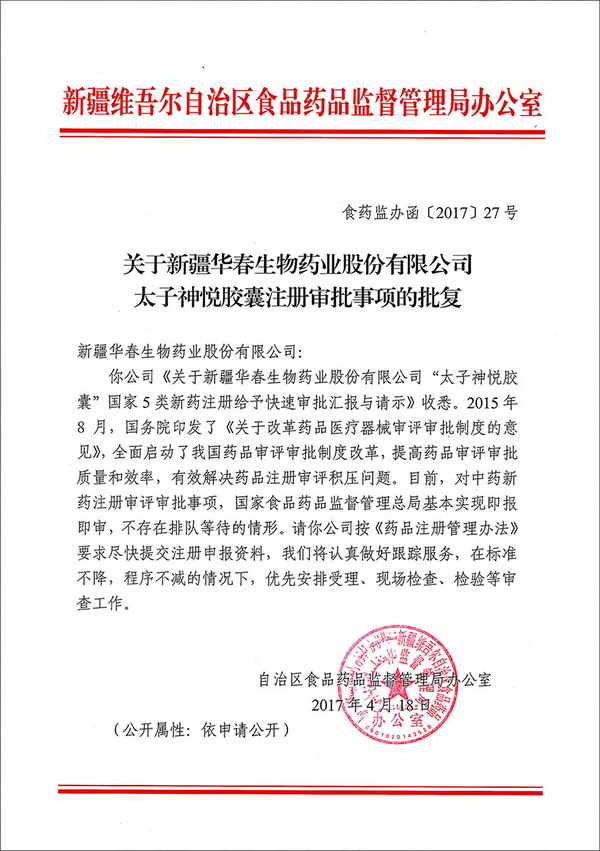 日前,自治區藥監局對新疆華春生物藥業股份有限公司關于抗抑郁新藥太子神悅膠囊注冊審批事項作出批復:國家食品藥品監督管理總局基本實現即報即審,不存在排隊等待的情形。請你公司按《藥品注冊管理辦法》要求盡快提交注冊申報資料,我們將認真做好跟蹤服務,在標準不降,程序不減的情況下,優先安排受理、現場檢查、檢驗等審查工作。