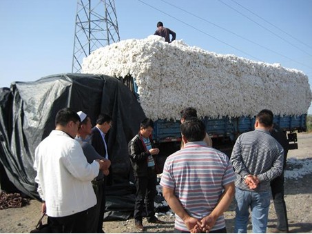 軋花(hua)廠工(gong)作人(ren)員在附近的一個(ge)棉花(hua)交易(yi)市場做調研(yan)