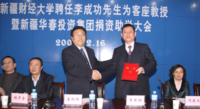 儀式上,華春投資集團為新疆財大工商管理學院捐助了10臺筆記本電腦。李成功先生說,接過這個教授聘書,覺得沉甸甸的,這不僅僅是一份聘書,而是一份對教育事業盡力的社會責任。華春投資集團還將于2010年開始在5年時間內,對新疆財經大學50名家境貧寒的學生每人資助3000元、50名品學兼優的學生每人資助5000元,還準備為該校籌建一座教學樓。作為新疆財經大學的客座教授,有責任為我們新疆財經大學的教書育人事業貢獻一份心力。