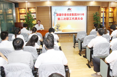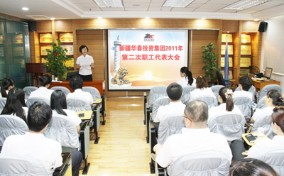 新疆華春投資集團有限公司2011年第二次職工代表大會于7月30日上午在新疆華春投資集團子公司新疆恒潤實業有限公司培訓室召開,會議由高青同志主持。參加會議的應到職工代表51人,實到職工代表 49人。
