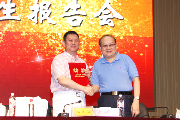 李成功總裁被新疆教育學院聘為客座教授,新疆教育學院黨委副書記閆科培為李總裁頒發了聘書。參加報告會的學生為李總裁佩戴了新疆教育學院精致的校徽。