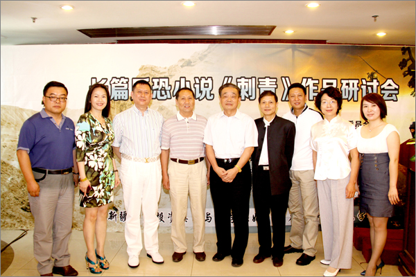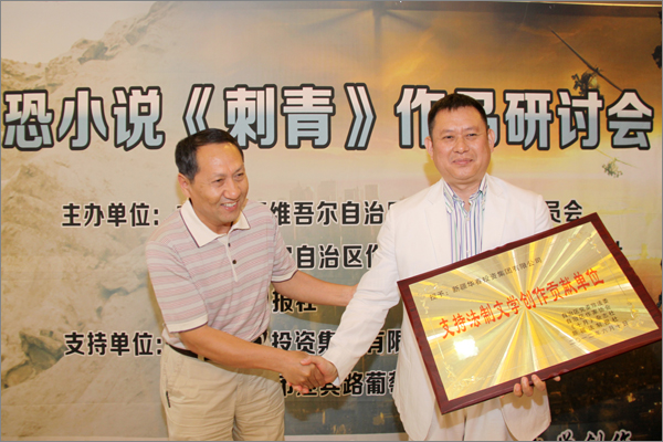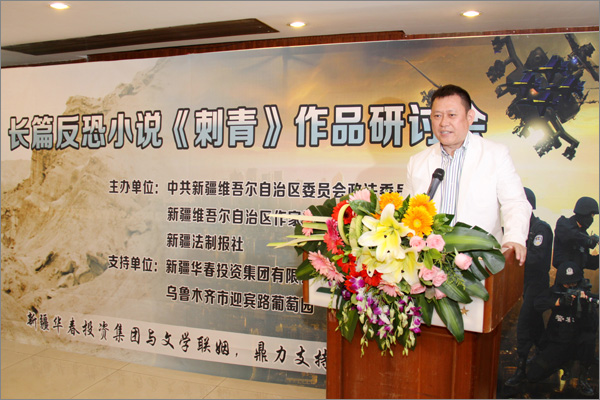 由自治區黨委政法委、作家協會、新疆法制報社主辦的、由新疆華春投資集團鼎力資助支持的法制文學創作“長篇反恐小說《刺青》作品研討會”,于2012年6月10日在鴻鑫酒店舉行。自治區黨委政法委授予新疆華春投資集團為“支持法制文學創作貢獻單位”,頒發了獎牌。新疆華春投資集團李成功總裁、王春容董事與華春集團統戰部、外事、工會的負責人參加了研討會。