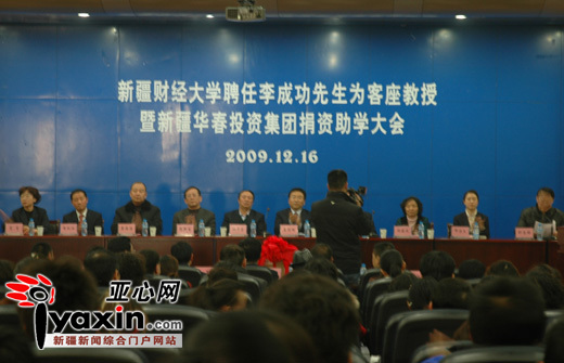 亞心網(wang)(wang)iyaxin.com訊(本網(wang)(wang)記者 邱鳴)12月16日下午(wu),新疆(jiang)華春投資集團(tuan)董事局主席(xi)兼總裁(cai)李成(cheng)功接受了新疆(jiang)財(cai)經大學(xue)副校長姜錫(xi)明頒發的(de)聘書,成(cheng)為(wei)新疆(jiang)財(cai)經大學(xue)客座教授(shou)。