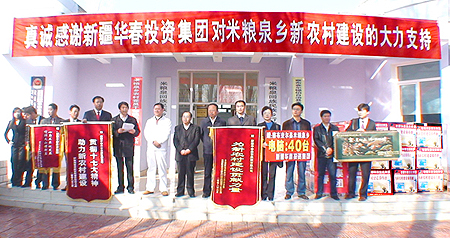 2008年的3月8日上午,盡管新疆大地春寒料峭,但在伊犁州察布查爾錫伯族自治縣米糧泉回族民族鄉卻是一派溫暖熱烈的景象:因為在這里正舉辦著由自治區黨委農村工作辦公室、自治區社會主義新農村建設規劃領導小組和伊犁州黨委新農村建設領導小組與新疆華春投資集團有限公司共同主辦的向米糧泉鄉捐贈40臺電腦和10萬元現金的儀式,新疆華春投資集團是首家向自治區社會主義新農村建設工作給予大力支持的民營企業。