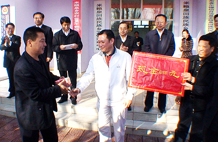 新疆(jiang)華春投資(zi)集團董(dong)事(shi)局(ju)主席兼總裁(cai)李成功先生親手將10萬元現(xian)金交(jiao)付于(yu)米糧泉鄉領導