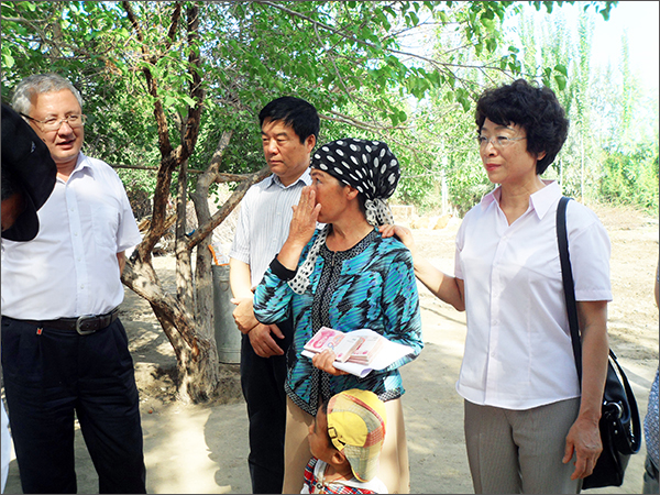 接著,到貧困戶吾布力•馬木提家去慰問。戶吾布力•馬木提大兒子出車禍去世,留下一個小孫子,因妻子患病花費較大而致貧。李湘林副主席把華春資助的2萬元錢送到他妻子的手上,他妻子手捧著錢淚流滿面,她可能一生都沒有一次拿過這么多的錢,對于這樣一個病人,得到的是救命的錢!