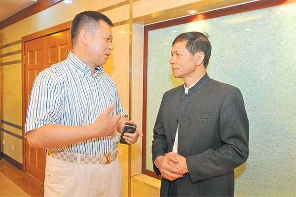 新(xin)疆(jiang)華春投(tou)資集團有限(xian)公(gong)司(si)董(dong)事局主(zhu)席(xi)兼總裁李成功(左)與新(xin)疆(jiang)法(fa)制(zhi)報社社長(chang)蔡宇知探討企(qi)業法(fa)人(ren)治理結構話(hua)題(ti)。