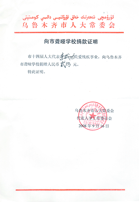 市人大出具的給聾(long)啞學校捐款證明(ming)