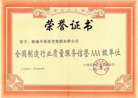 在不平凡的2008年即將逝去之時,新疆華春投資集團以其實際,贏得了相應的眾多榮譽:10月被中國質量信譽監督協會評為全國制造行業質量服務信譽AAA級單位;11月被中國建設信用評價中心、中國工程質量管理委員評為 “2008年(首批)全國建設信用誠信企業”和“全國政府放心、用戶滿意先進單位”,頒發了獎牌和證書(證書編號:Z0080100316)。